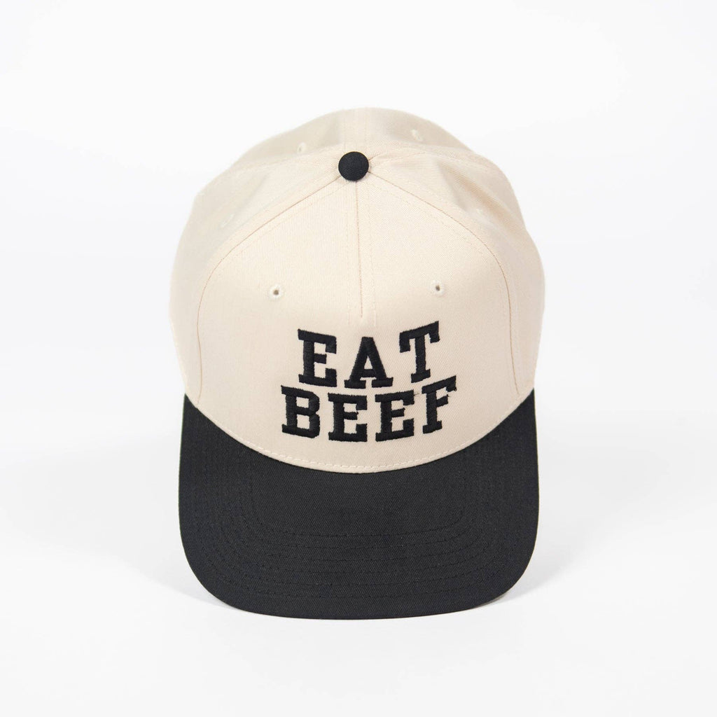 Grab this quirky Eat Beef Trucker Hat and show off your love for beef in a fun way! With an embroidered 'EAT BEEF' in black and a stylish cream top and black bill, this trucker hat is the perfect accessory for any casual outfit. Time to add some beefy flavor to your wardrobe!