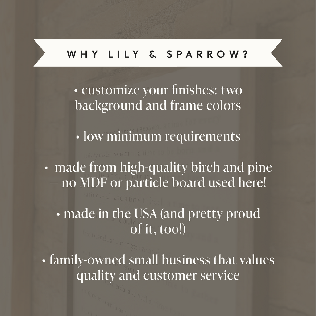 Our wood arches are here! Now you can grab your favorite Lily and Sparrow designs on a brand new style. Lean them against other L&S wood signs to add some depth to your displays, layer them with other decor or tuck them in a wood stand (sold separately) and use as table decor. There are so many ways to use these. They're trendy, cute and a great price point for your customers too! DETAILS: • SIZING: approx. 7x10", 11x25" or 16x23" + 5 mm thick (*sizing may vary by a 1/2 inch) • EDGES: raw wood • BACK: blank, raw wood; Lily & Sparrow stamped logo • OTHER: wood stand sold separately + hanging hardware NOT included