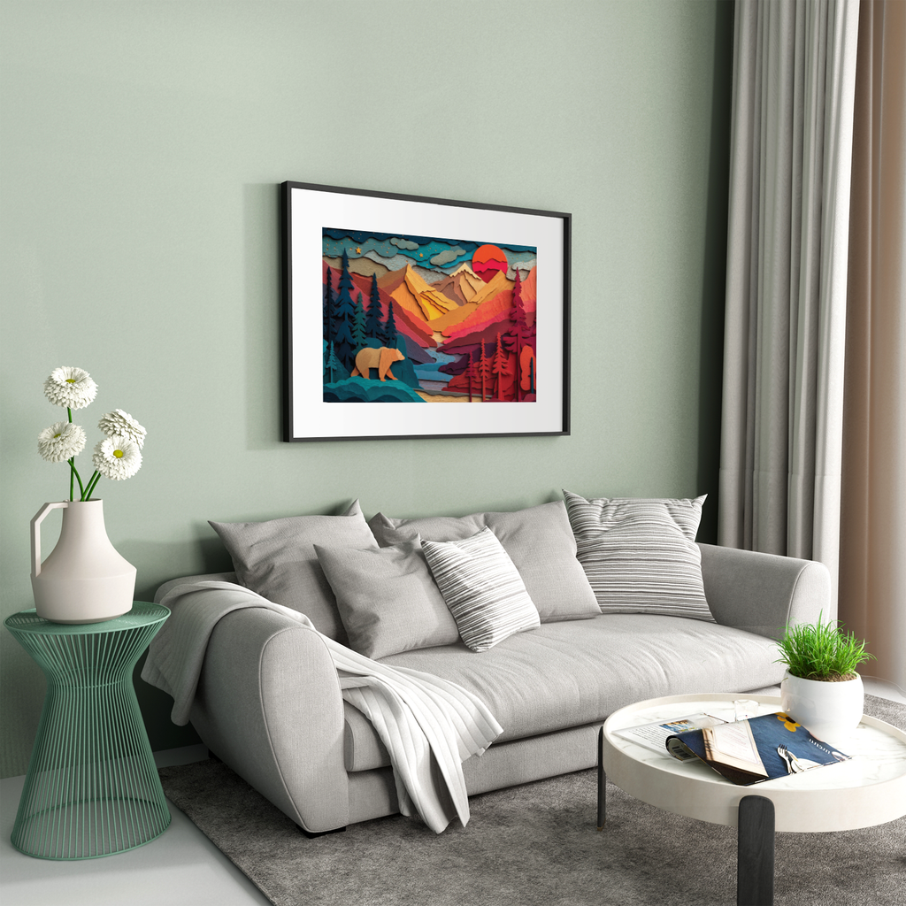 Bring the outdoors to your table with bold wood-cut layers, glowing mountains, starlit skies, and a curious bear—an adventure in every piece.