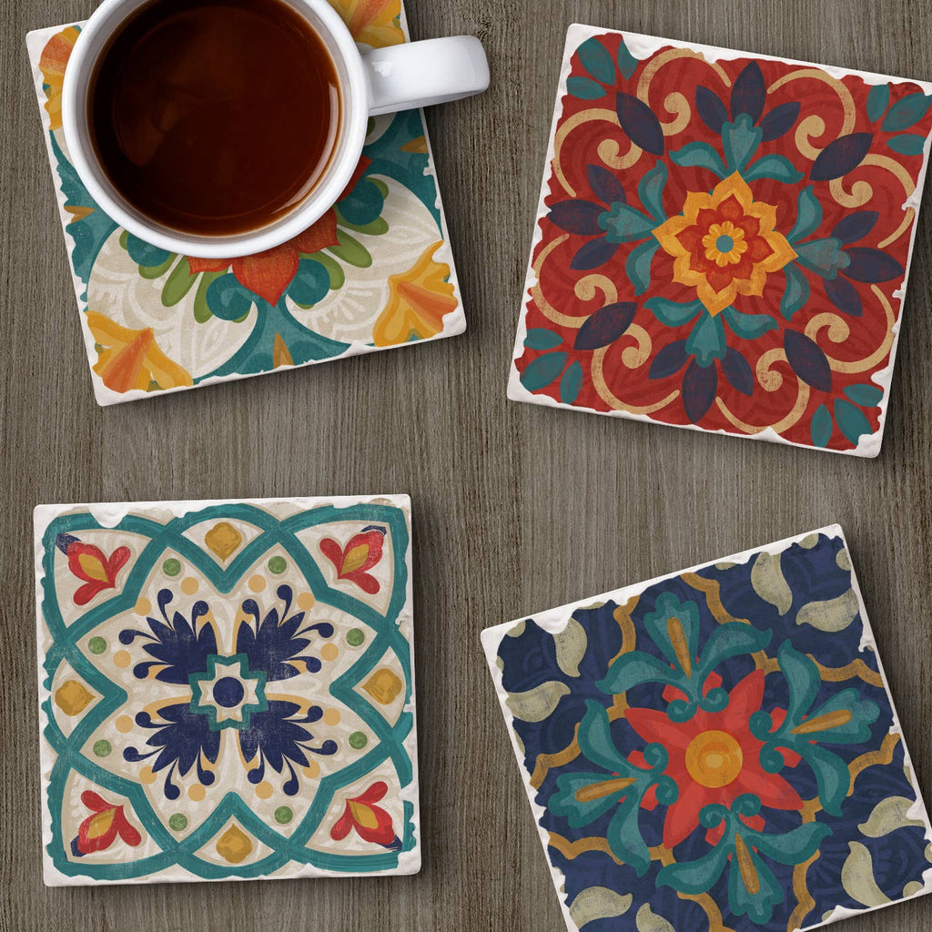 Each Coaster displays a different, coordinating image. Manufactured in the USA of absorbent stone to absorb excess condensation from beverages. Cork backing protects your surfaces from scratches and stains. Each Coaster measures 4” square. Features a Tumbled Tile edge to give it a classic yet rustic appearance. Beautiful artistic designs allow the Coaster to remain displayed even when not in use. This 4 pack Coaster Set makes a wonderful gift for family and friends at any time of the year. Arrives in clear acetate box where each image can be seen. Acetate box measures 8” x 4” x 0.50” and includes a hang tab.