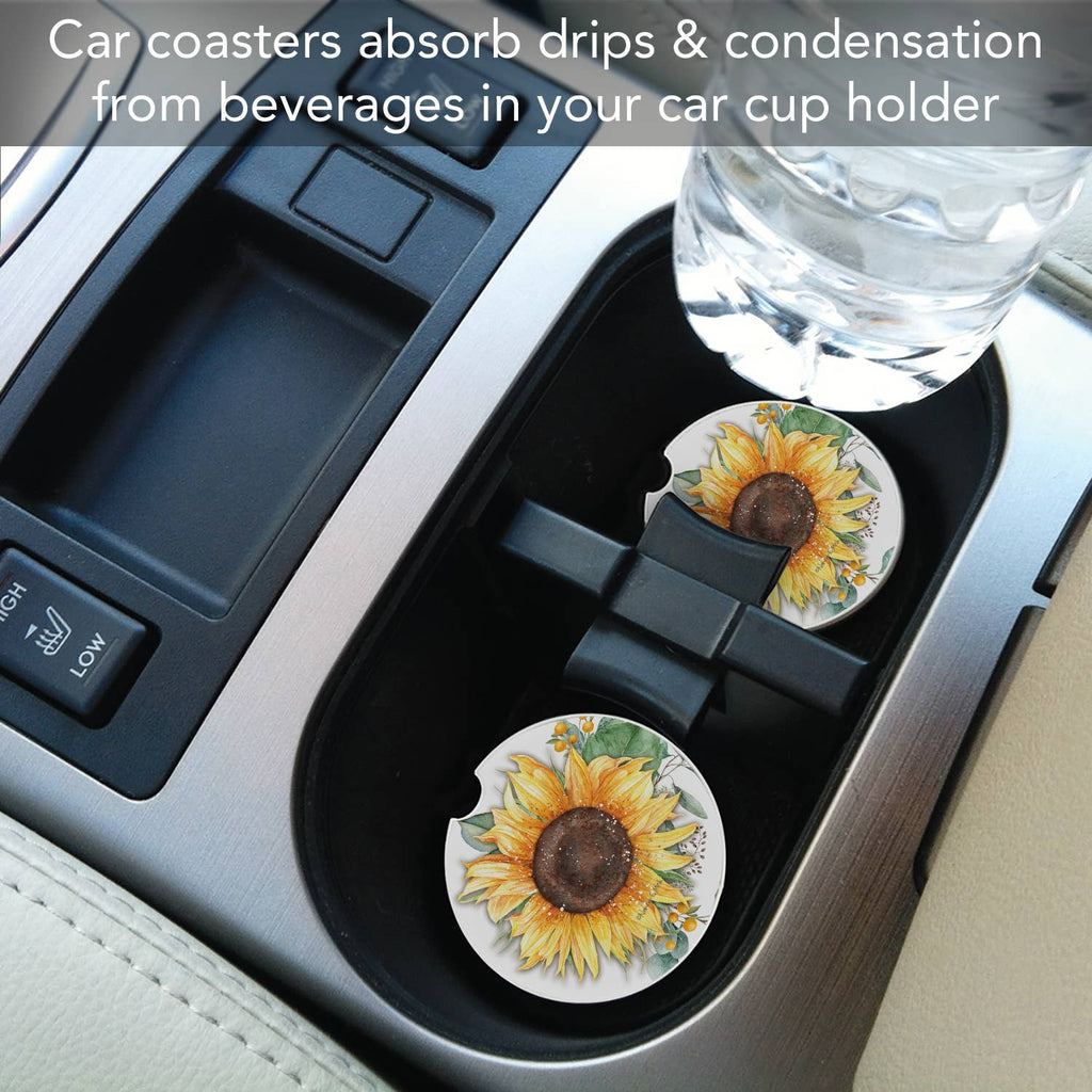 -Manufactured in the USA of absorbent stone to absorb excess condensation from beverages. Assists to keep your car's cup holder clean and dry. Convenient notch on side of the car coaster, makes it easy to remove while detailing your car. Beautiful artwork adds distinction to your vehicle’s interior. Clean the coaster by wiping clean with damp cloth and mild detergent. Measures 2.6 inches round and fits most vehicle cup holders. Find that special design to complete your vehicle's personality. Family and Friends will love receiving these long lasting, attractive Coasters for any occasion of the year.