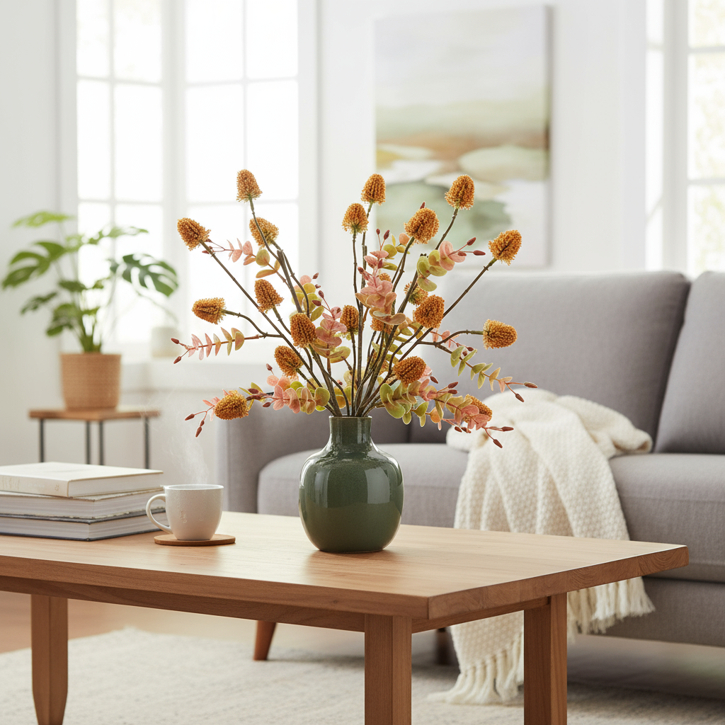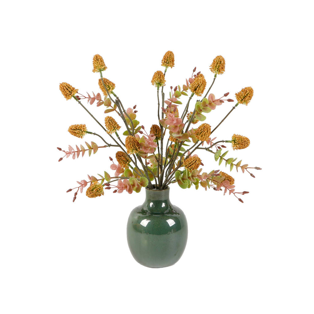 Brighten any space with this charming faux wildflower arrangement, featuring warm golden blooms and soft pink eucalyptus stems. The lifelike mix adds a touch of nature-inspired elegance without any maintenance. Set in a glossy green ceramic vase (4.725”W x 5.875”H), this arrangement stands 17” tall and 9” wide, making it the perfect accent for desks, shelves, entry tables, or gifting.