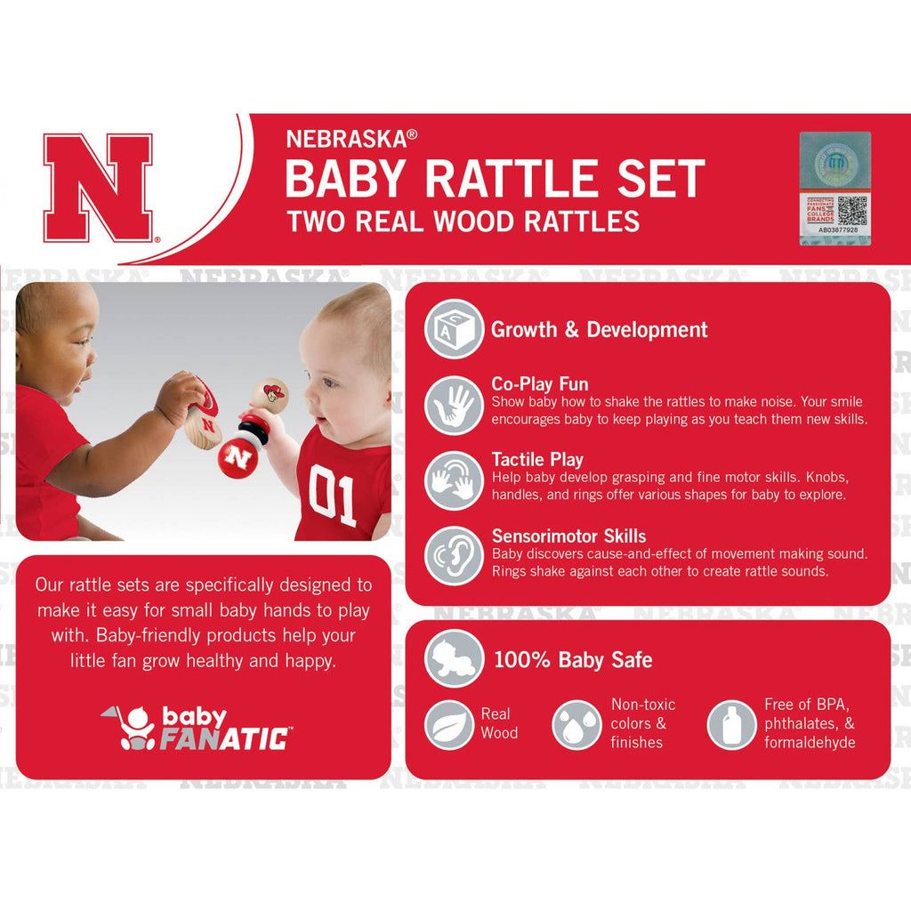 Introduce your little one to the world of sports with the Masterpieces BabyFanatic Wood Rattle 2 Pack, featuring the NCAA Nebraska Cornhuskers. Crafted from durable wood, these rattles are perfect for tiny hands and designed for extended playability. The vibrant team colors make them an exciting addition to any nursery, while the multi-color design captures your baby's attention. Measuring 6 inches in height, 2.38 inches in length, and 8 inches in width, these rattles are the ideal size for babies. With a focus on safety, they are free from any hazardous materials and require no batteries. The set is perfect for unisex children and is a great gift for any Nebraska fan. Hand wash only to maintain their quality and longevity. This officially licensed baby toy set is a must-have for any young Cornhuskers supporter. Whether you're looking for a unique Nebraska pacifier clip or simply want to add to your collection of baby rattles, this set is a fantastic choice. With a theme centered around sports, it encourages