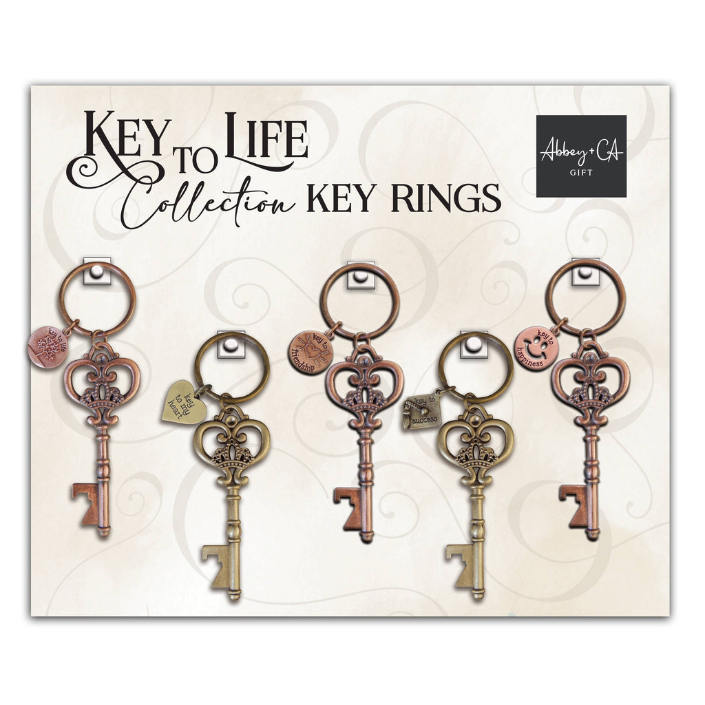 Key rings with antique inspired design, crafted in cast metal, and finished in brass ox or copper ox with attached 2-sided charm. Overall size is 1 ¼” W x 4 ¼” L. Poly bagged.